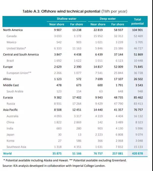 國(guó)際能源署(IEA)發(fā)布2019年海上風(fēng)電展望報(bào)告,認(rèn)為全球海上風(fēng)電的技術(shù)潛力為420,878 TWh(421萬(wàn)億千瓦時(shí))/年,其中主要國(guó)家的潛力分別為: