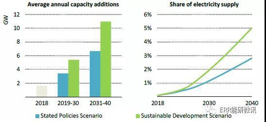 預(yù)測(cè)的全球海上風(fēng)電裝機(jī)容量和在電力供應(yīng)中的份額,按情景劃分