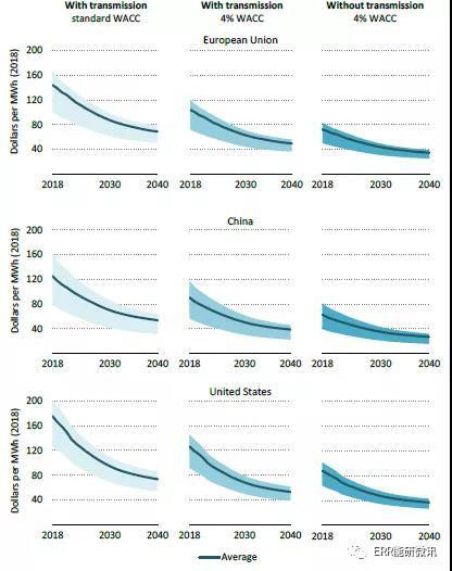 2018~2040年歐盟、中國(guó)和美國(guó)新建海上風(fēng)電項(xiàng)目的平準(zhǔn)化度電成本