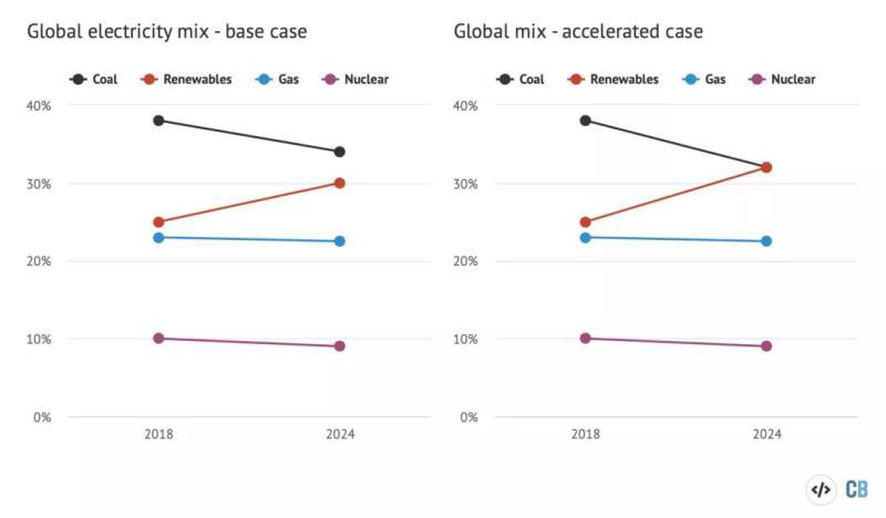 由于大部分需求增長將由可再生能源來滿足,它們將在全球電力結構中占據(jù)越來越大的份額。在“基本情況”下,可再生能源(紅線)的份額將從目前的25%增加到2024年的30%,五年內增加5個百分點。這在很大程度上是以煤炭(黑線)的減少為代價的,后者將下降到混合能源的34%,但仍將是全球電力供應的最大貢獻者。在“加速發(fā)展”的情形下,2024年可再生能源發(fā)電將達32%,與煤電持平。