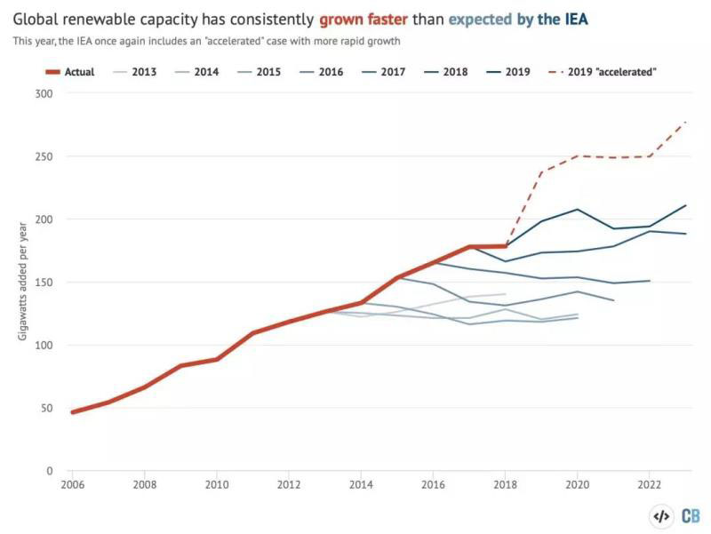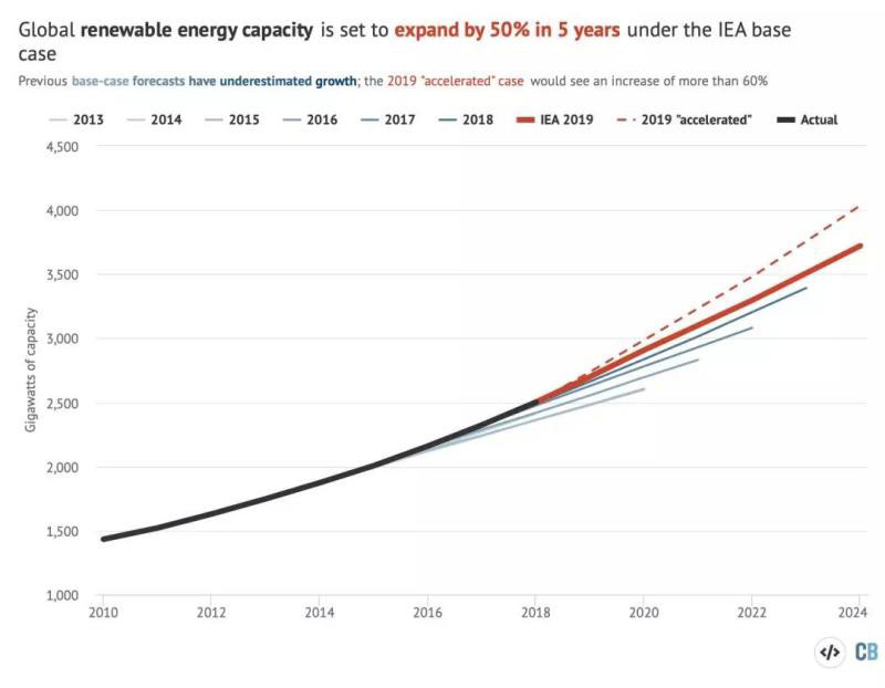 值得注意的是,正如上圖所示,IEA的“基本情況”預測在歷史都低估了增長速度。這一次IEA在其2019年預測中還包括了“加速發(fā)展”(accelerated