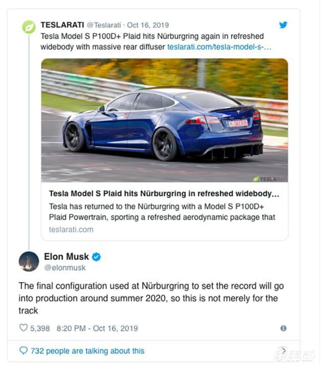 特斯拉CEO在推特上跟帖并對該報道進行了回應(yīng),馬斯克表示,正在紐博格林上進行測試、搭載了Plaid三電機系統(tǒng)的特斯拉Model S P100D+車型預(yù)計將在2020年夏季投入生產(chǎn)。