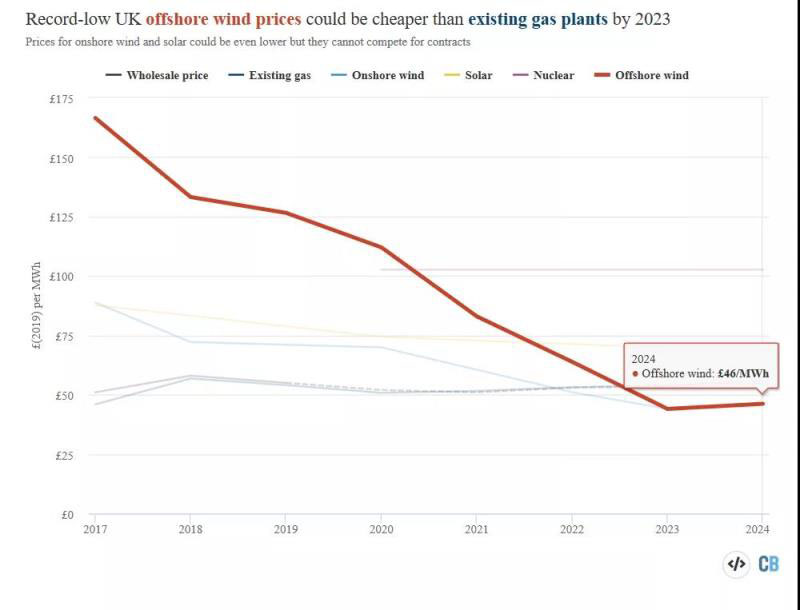 英國海上風電的競價結(jié)果顯示,英國可再生能源將很快超過彭博新能源財經(jīng)創(chuàng)始人邁克爾·利伯里希(Michael Liebreich)在2017年預(yù)測的兩個“臨界點”中的第二個。第一個臨界點是新建的可再生能源的成本低于新建化石燃料電廠便宜,這一個臨界點已經(jīng)達到。第二個臨界點是新建可再生能源發(fā)電成本低于現(xiàn)有的化石燃料發(fā)電廠的運行成本。直到去年,英國專家一般認為第二個臨界點將在2030年左右實現(xiàn)。由于第二個臨界點提前來臨,能源的“三難困境“也將終結(jié)。能源三難困境指的是在” 廉價、安全、低碳“三個目標,電力供應(yīng)只能滿足其中的兩個。但是,英國海上風電競標結(jié)果證明“能源三難困境”也不再成立,因為綠色能源是最便宜的。