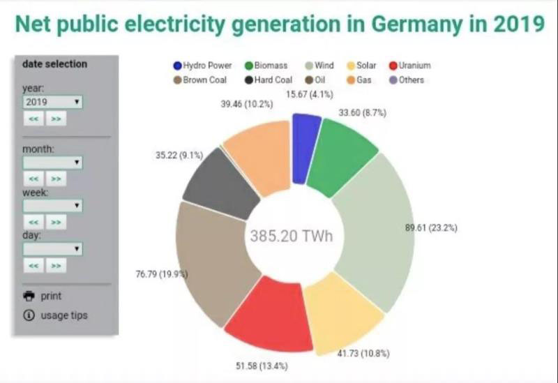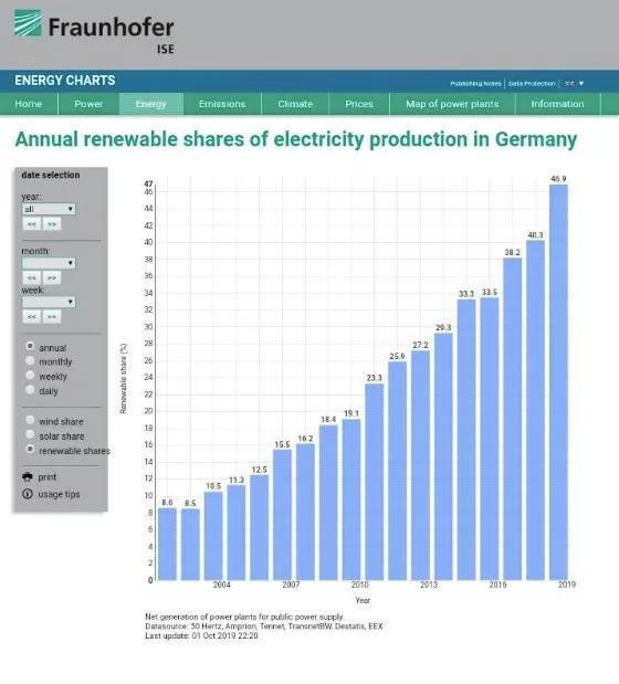根據(jù)德國Fraunhofer Institute for Solar Energy Systems匯總的數(shù)據(jù),2003年德國可再生能源發(fā)電占比僅為8.5%,2010年達(dá)到19.1%,2015年達(dá)到33.3%,2018年達(dá)到40.3%。而2019年前9個(gè)月可再生能源發(fā)電占比已經(jīng)達(dá)到46.9%(風(fēng)電23.2%、太陽能10.8%、生物質(zhì)8.7%、水電4.1%),同期煤電占比29.0%、天然氣發(fā)電10.2%、核電13.4%。