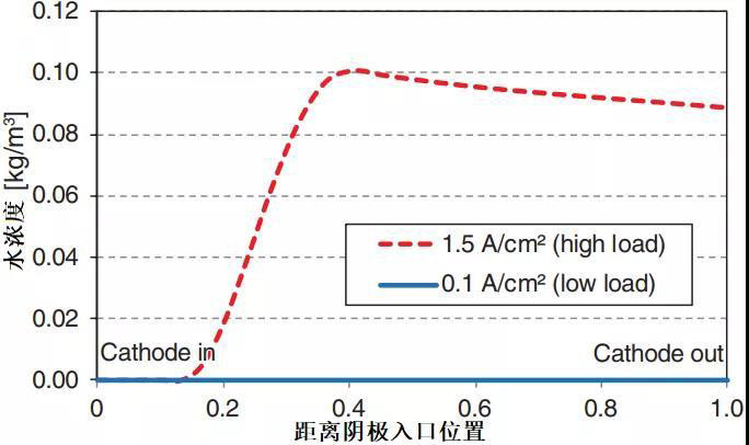 相反,當空氣側(cè)注入海鹽氣溶膠形式的NaCl,并沒有發(fā)現(xiàn)阻值上升。為此,本田汽車公司對Clarity燃料電池陰極流場冷凝水情況進行了模擬。結(jié)果表明,在該研究的測試工況下陰極流道沒有產(chǎn)生冷凝水,歐姆阻值沒有上升是因為海鹽氣溶膠NaCl沒有溶解成冷凝水和離子,鈉離子并沒有進入質(zhì)子膜。同時研究指出,應(yīng)當考慮高負荷(大電流密度)條件下海鹽氣溶膠NaCl進入質(zhì)子膜的情況(陰極流道有冷凝水)。