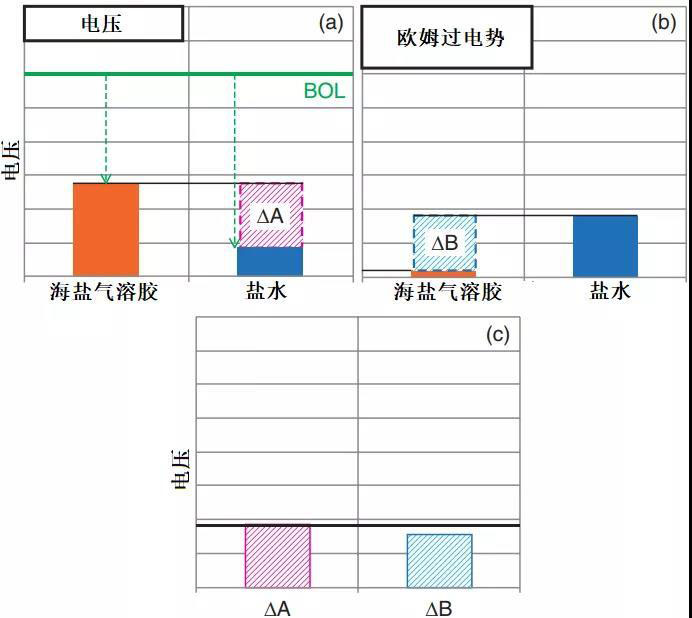 由上圖可知,海鹽氣溶膠形式的NaCl對電池性能衰減的影響弱于NaCl水溶液。通過分析歐姆過電勢發(fā)現(xiàn),相比海鹽氣溶膠,當空氣中注入NaCl水溶液,歐姆過電勢較大。圖中陰影部分的電壓降△A值剛好接近陰影部分的歐姆過電勢壓降△B值。因此,可以認為電壓降正是由歐姆過電勢引起的。相關(guān)研究里提到,當質(zhì)子交換膜中聚合物鏈傳遞鈉離子時(非氫離子),質(zhì)子膜的阻抗將大幅增加。因為,當空氣中含有NaCl水溶液時,鈉離子會取代氫離子,在膜中傳遞,引起歐姆過電勢增加。