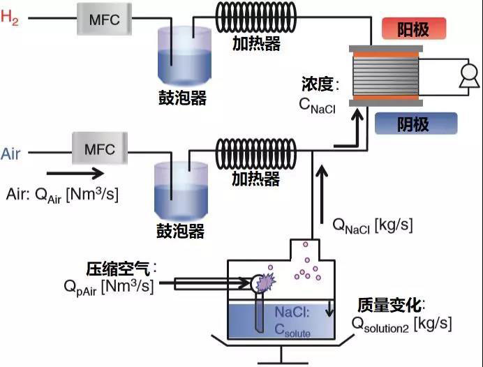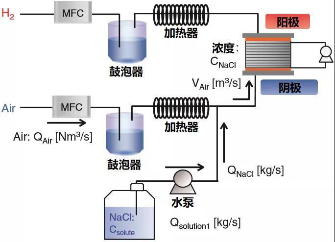 注入NaCl水溶液的實驗原理如上圖所示。采用高壓水泵精準調(diào)節(jié)水溶液流量,確保電堆入口空氣中NaCl濃度值為100 μg/m3。進堆NaCl流量QNaCl由NaCl水溶液濃度Csolute和NaCl水溶液流量Qsolution1計算得出,即QNaCl=Csolute*Qsolution1??諝怏w積流量VAir根據(jù)電流陰極氣體流量QAir、進堆溫度TAir和進堆壓力PAir計算得出,即VAir=QAir*101.3/PAir*TAir/273。進堆NaCl濃度由CNaCl=QNaCl/Vair計算得出。