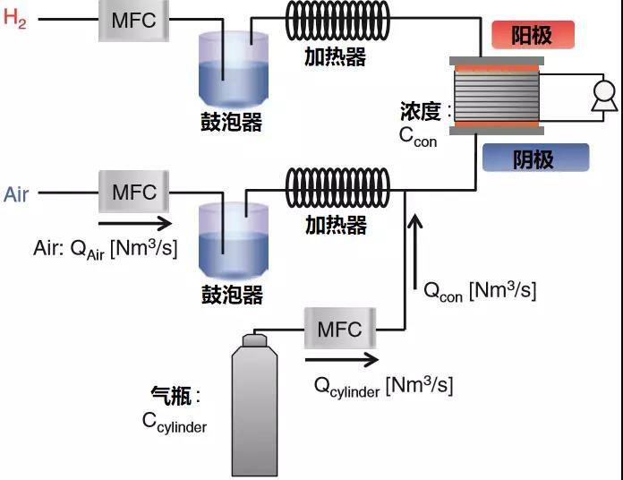如上圖所示,10片Clarity燃料電池單體串聯(lián)組成的電堆為實驗觀察對象。高純氫氣通過鼓泡器加濕和加熱至車載燃料電池相同工況下進入電堆;干凈空氣經(jīng)加熱和加濕后與來自T型連接結(jié)構(gòu)的雜質(zhì)混合至指定濃度后進入電堆。采用KOFLOC Model 3660 SERIES質(zhì)量流量控制器對氣瓶中的雜質(zhì)氣體流量控制以達到穩(wěn)定的濃度。