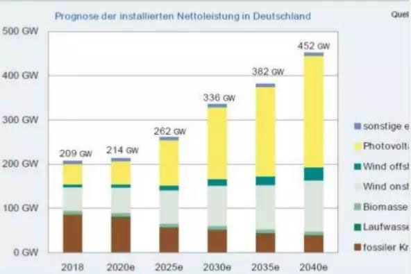 當(dāng)然,除了光伏發(fā)電外,還必須進(jìn)一步開(kāi)發(fā)風(fēng)能,生物質(zhì)和其他可再生能源。在風(fēng)電方面,分析師預(yù)計(jì)地面上安裝的風(fēng)力渦輪機(jī)每年凈增加3GW。到2030年,地面風(fēng)電裝機(jī)容量增加到90GW,到2040年將增加115GW。在海上風(fēng)電方面,計(jì)劃到2020年將擴(kuò)大到7.7GW,到2030年擴(kuò)大到15GW。到2040年,海上風(fēng)電裝機(jī)容量預(yù)計(jì)為29.4GW。