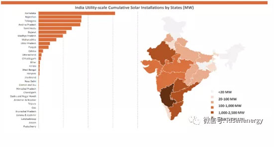 從項(xiàng)目分布地區(qū)上看,印度大型地面電站項(xiàng)目主要集中在印度西南部及南部地區(qū),前十大州幾乎包攬了印度全部大型項(xiàng)目裝機(jī)量。
