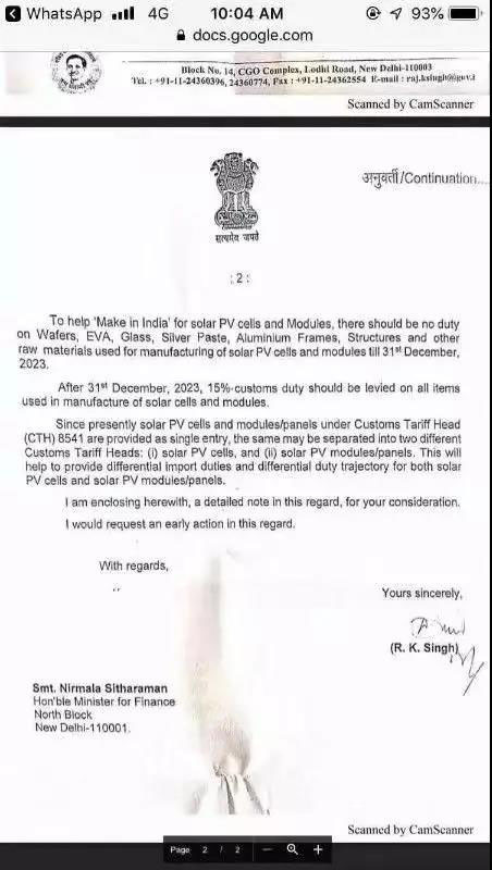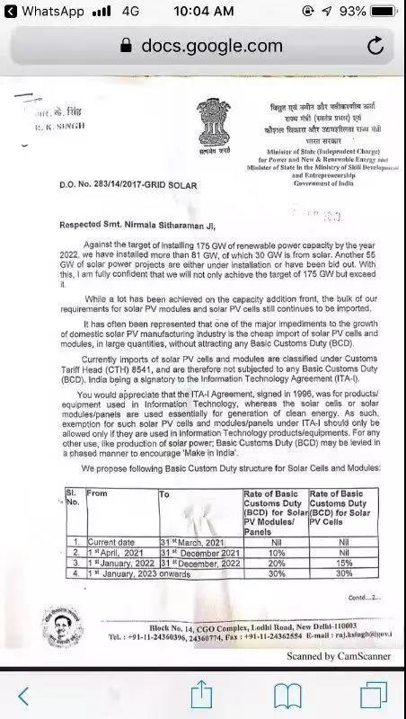 然而,印度政府的行事再次讓人跌破眼鏡,就在昨天,有消息稱,印度將再次加稅!印度新能源和可再生能源部(MNRE)負(fù)責(zé)人辛格(RK Singh)建議財政部將進(jìn)口太陽能電池和組件納入基本關(guān)稅(BCD),以便在“印度制造”(Make in India)計劃下對國內(nèi)制造業(yè)進(jìn)行再提振。