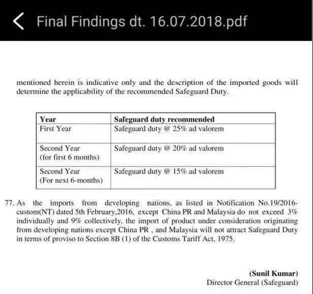 圖片:印度在2018年7月公布的最終保障稅