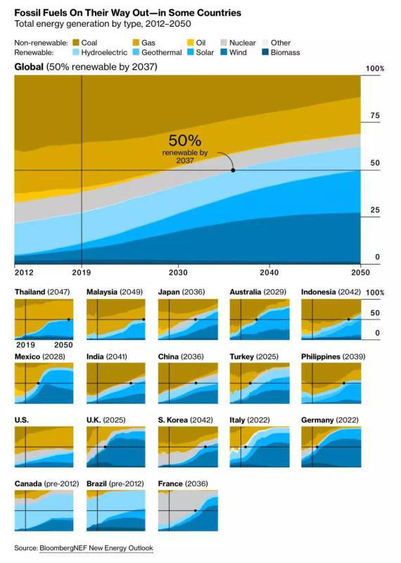 根據(jù)彭博新能源財經(jīng)的評估,在全球范圍內(nèi)可再生能源發(fā)電到2050年將占總發(fā)電量的50%。部分國家實現(xiàn)50%可再生發(fā)電的時間如下圖所示: