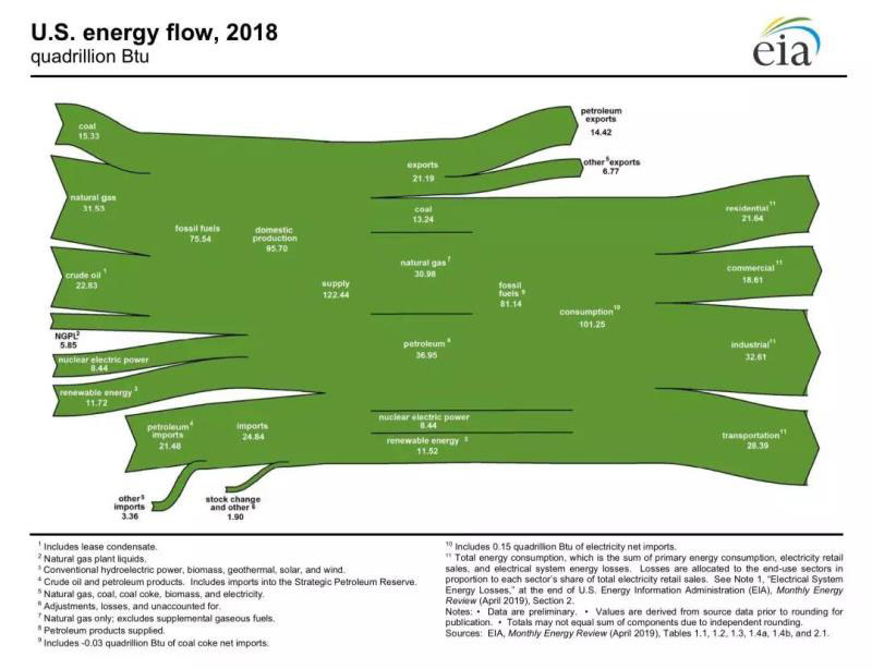 根據(jù)美國能源信息署發(fā)布的2018年美國能流圖,2018年美國能源消費101.25夸德(Quads,1夸德大約相當(dāng)于2500萬噸標(biāo)準(zhǔn)油當(dāng)量),其中80.1%來自化石能源(煤炭13.1%、天然氣30.6%、石油36.5%);核能占8.3%;可再生能源占11.4%。