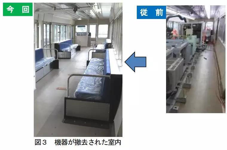 該列車將客艙內(nèi)搭載的主要機(jī)器移設(shè)到地板下,通過(guò)增加燃料電池模塊的輸出密度來(lái)縮小設(shè)備的尺寸。與普通火車一樣,在列車的的車廂中安裝了長(zhǎng)座位。