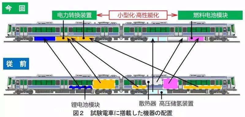 R291列車的燃料電池由于高輸出密度化、冷卻裝置的分散配置等優(yōu)點(diǎn),使燃料電池模塊的輸出功率增加了50%,輸出體積減少20%。同時(shí)燃料電池的體積得以減小,使其適合安裝在地板下。