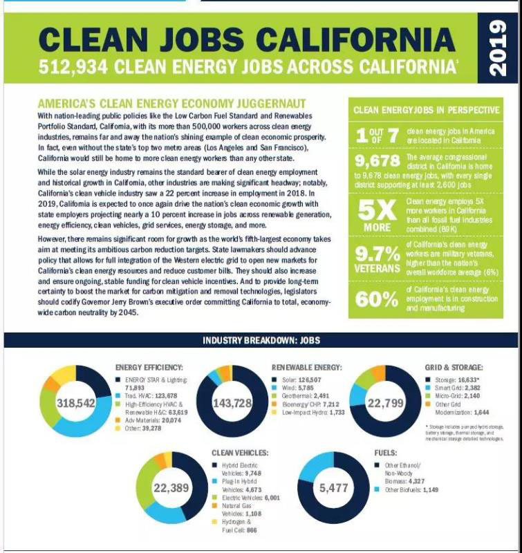 ——在全州范圍內(nèi),2018年清潔能源行業(yè)共有512,934個就業(yè)崗位。其中包括可再生能源就業(yè),如安裝太陽能和風(fēng)能;建設(shè)電動和混合動力汽車;在建筑物中進(jìn)行能源效率工作;制造清潔燃料和建設(shè)電池存儲項(xiàng)目。