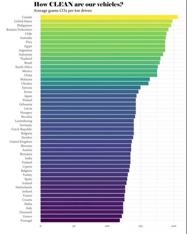 根據國際能源署(IEA)的全球汽車燃油經濟研究計劃(The Global Fuel Economy Initiative)的數據(全球輕型車統(tǒng)一測試規(guī)程),2017年全球各經濟體輕型燃油汽車平均碳排放如下: