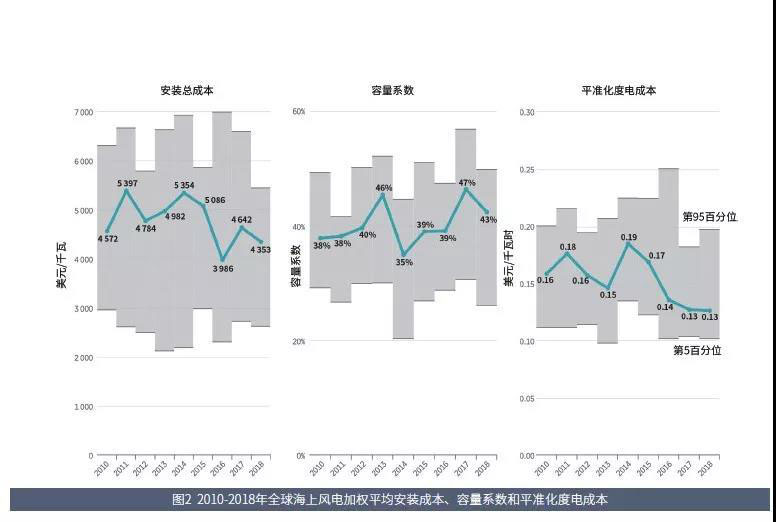 自2010 年以來,海上風電場的總安裝成本略有下降。然而,由于近年來每年新增裝機容量相對較低,新投產(chǎn)的海上風電場的總安裝成本同比波動較大。