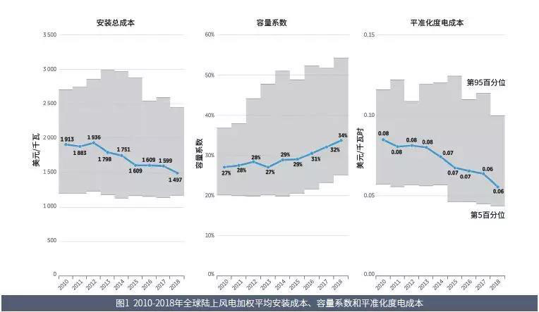 風電機組塔筒越高、掃風面積越大、容量越高,通常能從相同的風能資源中獲取更多電力,該趨勢使得2018 年投入使用的陸上風電場的全球加權平均容量系數(shù)從2017 年的32%升至34%。
