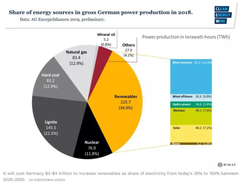 如果2025年到2050年間德國將可再生能源電力從今天的35%增加到100%,德國將需要花費(fèi)大約3.4萬億歐元(3.8萬億美元),是2000年至2025年花費(fèi)的7倍。