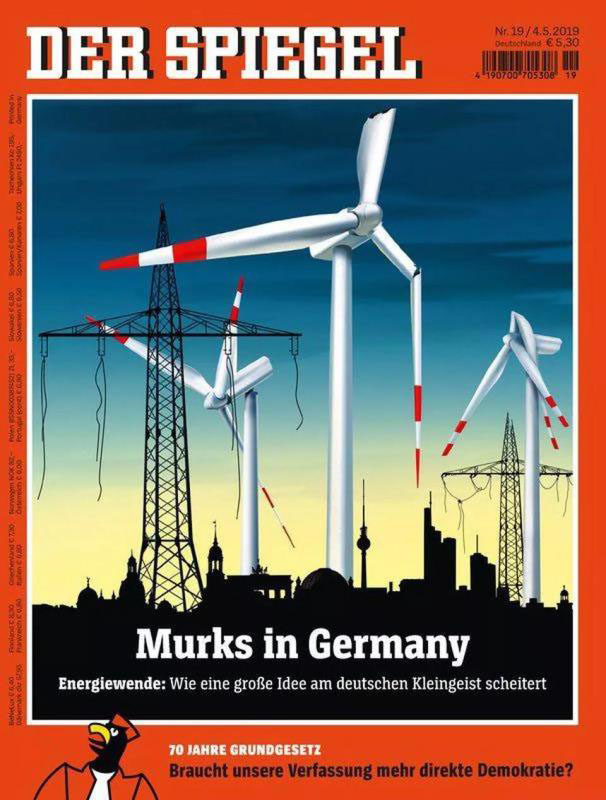 德國最大的新聞周刊“明鏡”(Der Spiegel)發(fā)表封面文章,題目是“Murks in Germany”(德國干的蠢事”,封面配圖表現(xiàn)的是破碎的風(fēng)力發(fā)電機(jī)、不完整的電力傳輸塔與柏林的黑暗輪廓。