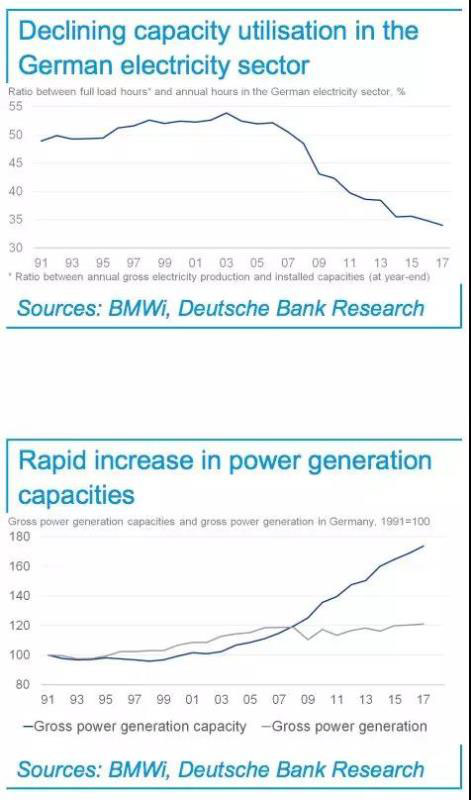德意志銀行近日發(fā)布研究報(bào)告,德國電力部門的容量利用率(以滿負(fù)荷小時(shí)數(shù)與總年度小時(shí)數(shù)相比)在過去幾年中持續(xù)下降。在1991年至1999年之間,即在實(shí)施“可再生能源法”之前,容量利用率剛剛超過50%并且趨于上升,在2003年達(dá)到頂峰(53.9%)。從那時(shí)起到2017年,德國發(fā)電裝機(jī)的利用率在2017年下降了約20個(gè)百分點(diǎn)(降至34%)。德國發(fā)電總裝機(jī)容量在2003年至2017年間增加了約70%,達(dá)到219吉瓦,這意味著裝機(jī)容量超過德國峰值負(fù)荷(略高于80吉瓦)約170%。然而在同一時(shí)期,總發(fā)電量僅增加了約7%。