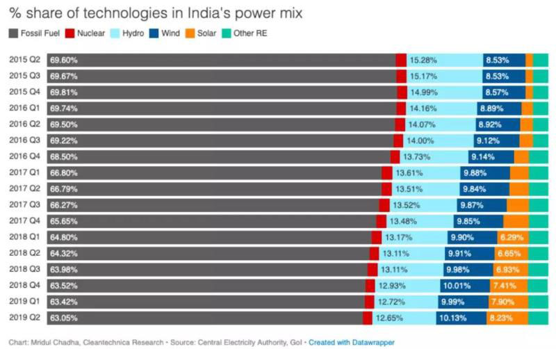 根據(jù)CleanTechnica Research的數(shù)據(jù),截至2019年6月底印度的化石燃料發(fā)電占總裝機(jī)容量的比例連續(xù)第14個(gè)季度下降。在2019年第2季度末,基于煤炭、柴油、天然氣和石腦油的化石能源發(fā)電裝機(jī)(226吉瓦)比例已降至63.05%(而2015年第2季度這一比例為69.60%),可再生能源發(fā)電所占比例為:水電12.65%、風(fēng)電(36.3吉瓦)10.13%、光伏(29.5吉瓦)8.23%