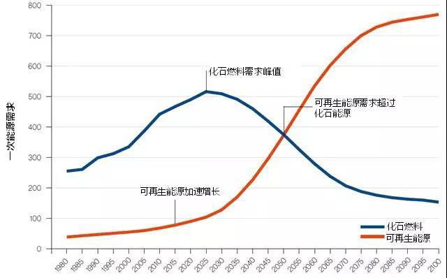 注:圖中數(shù)據(jù)為全球一次能源需求的預(yù)測(cè)量,對(duì)比在未來100年中化石能源與可再生能源需求的發(fā)展趨勢(shì)。從中可以看出,可再生能源需求在2015年迎來一個(gè)加速增長期,將于2050取代化石能源成為全球一次能源的主要來源。(數(shù)據(jù)來源:Shell Sky Scenario,2018)