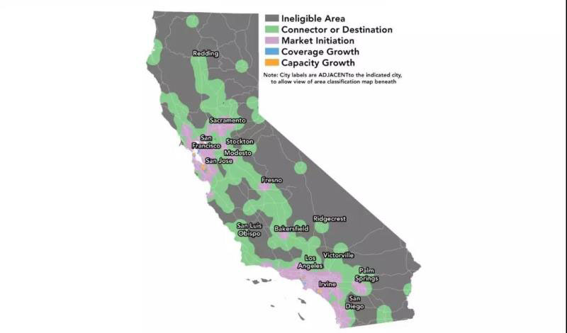 五、美國(guó)加州空氣資源局建議對(duì)能源委員會(huì)下一輪撥款支持的加氫站點(diǎn)進(jìn)行位置評(píng)估,以更好地契合EO B-48-18設(shè)定的200個(gè)站點(diǎn)目標(biāo)。確保加氫網(wǎng)絡(luò)建設(shè)滿(mǎn)足燃料電池汽車(chē)的覆蓋范圍和容量需要,并有效地利用政府資金來(lái)實(shí)現(xiàn)這些目標(biāo)是至關(guān)重要的。加州空氣資源局利用CHIT來(lái)確定一個(gè)合適的網(wǎng)絡(luò)來(lái)支持100萬(wàn)輛燃料電池汽車(chē)的部署目標(biāo)。下圖將引導(dǎo)符合2030年1,000個(gè)站點(diǎn)遠(yuǎn)景的區(qū)域布局,可在此基礎(chǔ)上對(duì)局部區(qū)域加氫需求進(jìn)行分類(lèi)以精簡(jiǎn)程序。