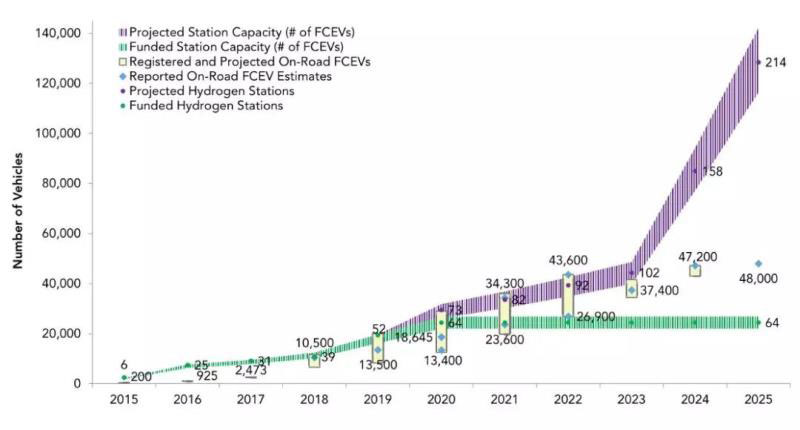 (當(dāng)前加州燃料電池汽車(chē)與規(guī)劃部署規(guī)模對(duì)比)