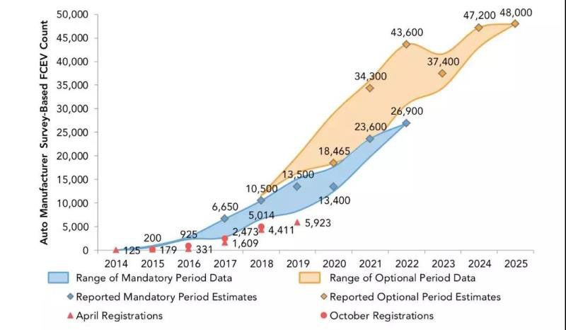 三、汽車(chē)制造商對(duì)燃料電池汽車(chē)的部署落后于EO B-48-18和CaFCP Vision中的設(shè)定目標(biāo)。目前,加州擁有5,923輛燃料電池汽車(chē),較去年同期增加了1,500輛,短期內(nèi)需要提速。畢竟,這一數(shù)據(jù)與2017年386%和2018年174%的增速不可同日而語(yǔ),與2022年2.69萬(wàn)輛和2025年4.8萬(wàn)輛的預(yù)期目標(biāo)更是相去甚遠(yuǎn)。