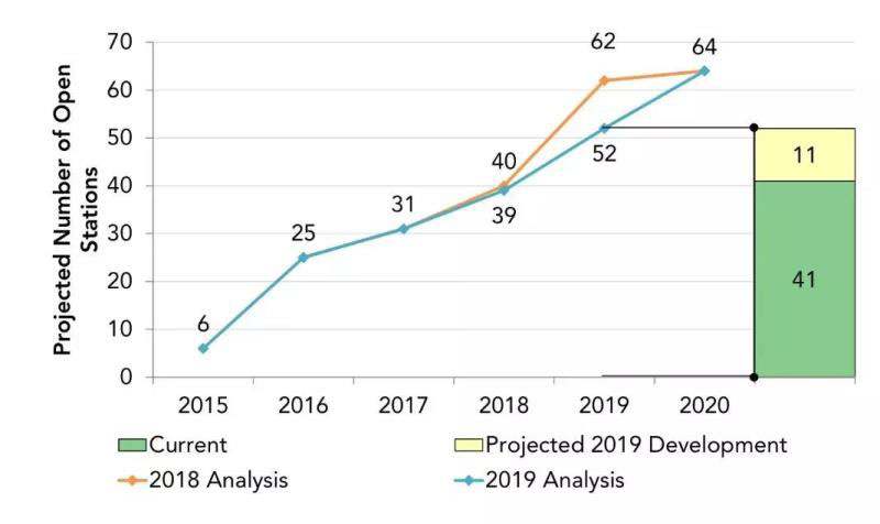 二、2018-2019年加氫網(wǎng)絡(luò)建設(shè)基本上按計(jì)劃實(shí)施。2020年6月前,將開(kāi)放11個(gè)加氫站,屆時(shí)合計(jì)擁有52個(gè)加氫站,略低于此前預(yù)計(jì)的2019年底62個(gè)加氫站運(yùn)營(yíng)的目標(biāo)。但所有64個(gè)受資助的加氫站預(yù)計(jì)仍將在2020年底前開(kāi)放,甚至將提前建成。