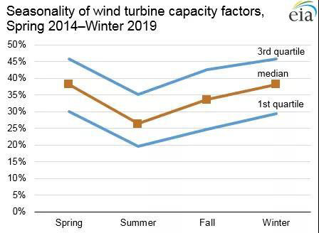 在全美范圍內(nèi),風(fēng)電廠容量系數(shù)往往是春季最高,到夏季下降約30%,然后在秋季中后期再次增加。2014年春季至2019年冬季,風(fēng)電容量系數(shù)的中位數(shù):春季38.2%、夏季26.4%、秋季33.6%、冬季的38.1%。