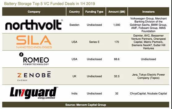 第二季度,上述三大領(lǐng)域的風(fēng)投資金在20項(xiàng)交易中躍升至15億美元,而2019年第一季度的23項(xiàng)交易僅為2.1億美元。2019年上半年電池儲(chǔ)能公司風(fēng)險(xiǎn)投資前五大融資交易如下: