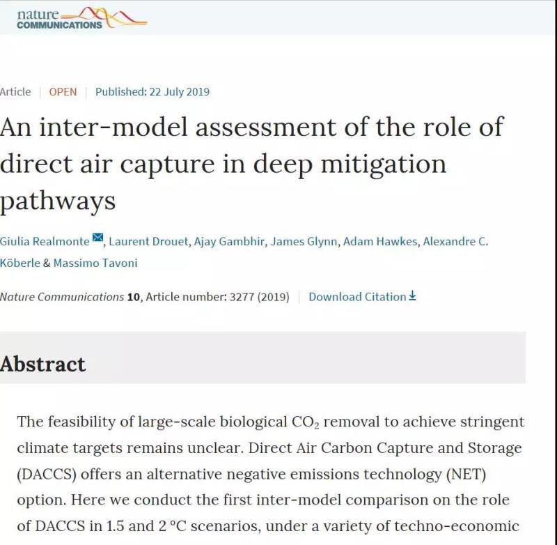 日前《自然·通訊》雜志發(fā)表意大利、英國等國學(xué)者的文章認(rèn)為,一種可行的負(fù)排放技術(shù)是直接將二氧化碳從大氣中捕獲,然后將二氧化碳然后埋在地下,該過程被稱為直接空氣碳捕獲和儲存(as direct air carbon capture and storage ,DACCS)。