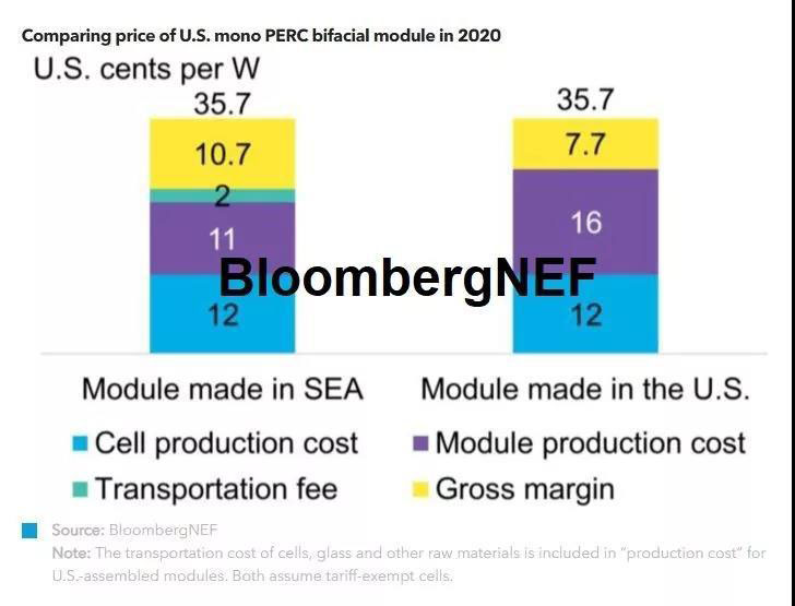 36美分/瓦的價格低于早先大多數(shù)對美國2020年組件價格的預期(40美分/瓦),但高于世界其它地區(qū)23美分/瓦的組件單價。之所以如此,是因為美國對從中國進口的電池片和組件征收包括反傾銷稅與反補貼,201及301關稅,使原產(chǎn)于中國的電池片和組件無法供應美國市場進而導致價格扭曲。雙面組件的免稅優(yōu)勢將一直保持到2022年2月,即201關稅條款終止之時。