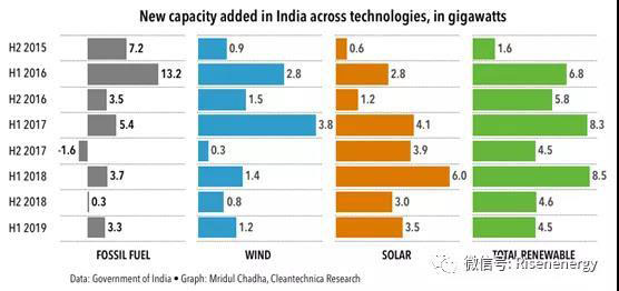 今年上半年,太陽能發(fā)電技術(shù)對印度新增發(fā)電能力的貢獻(xiàn)最大。在2019年1月至6月期間增加的7.8吉瓦新增產(chǎn)能中,太陽能占3.5吉瓦。
