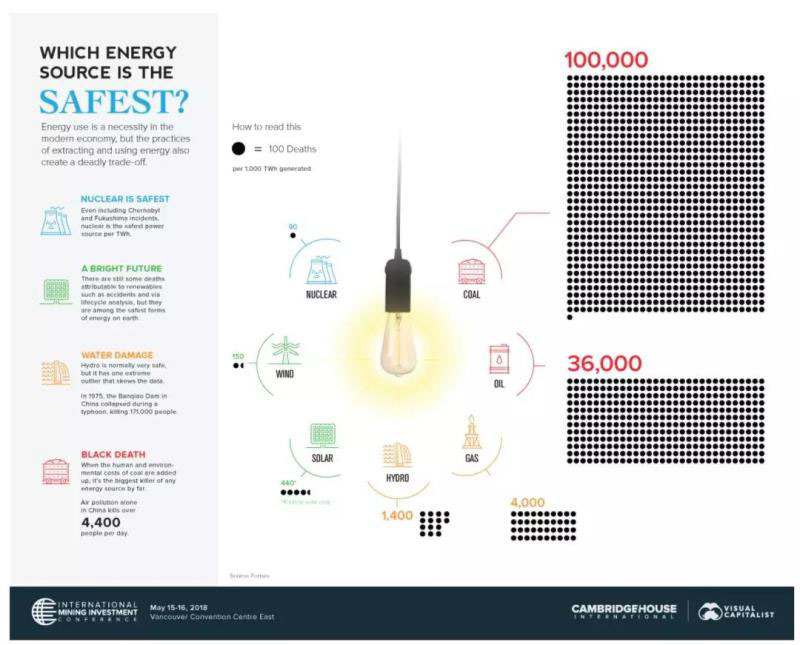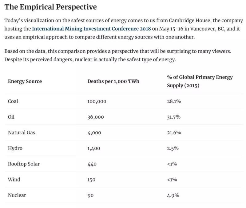 根據(jù)Cambridge House公司匯總的數(shù)據(jù),每發(fā)1萬億千瓦時(shí)(1000 TWh)的電力,不同發(fā)電技術(shù)造成的死亡人數(shù)如下: