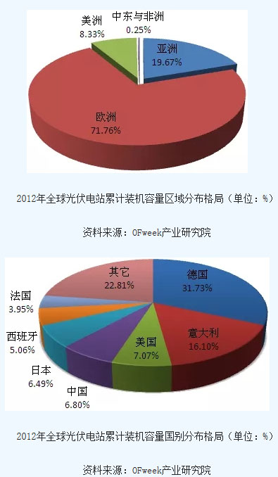 OFweek產(chǎn)業(yè)研究院數(shù)據(jù)顯示,2010年全球光伏發(fā)電總裝機(jī)容量超過40GW,主要應(yīng)用市場在德國、西班牙、日本、意大利,其中德國2010年新增裝機(jī)容量7GW;2011年全球新增光伏發(fā)電裝機(jī)容量超過30GW,比2010年新增13GW,至2011年底,全球光伏發(fā)電累計裝機(jī)容量達(dá)到71GW。截至2012年底,全球光伏發(fā)電累計裝機(jī)容量已超過100GW,歐洲裝機(jī)規(guī)模占全球總裝機(jī)規(guī)模的70%。其中,德國光伏電站累計裝機(jī)容量為32.41GW,占全球的31.73%,是全球累計裝機(jī)容量最大的國家;居第二位的是意大利,其光伏電站累計裝機(jī)容量為16.45GW,占全球的16.10%;居第三、四、五位的分別是美國、中國、日本,這三個國家光伏電站累計裝機(jī)容量在7GW左右,分別占7.07%、6.80%和6.49%。