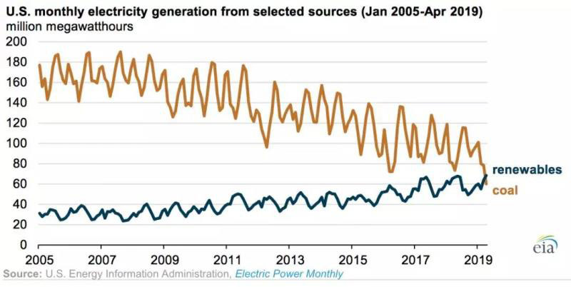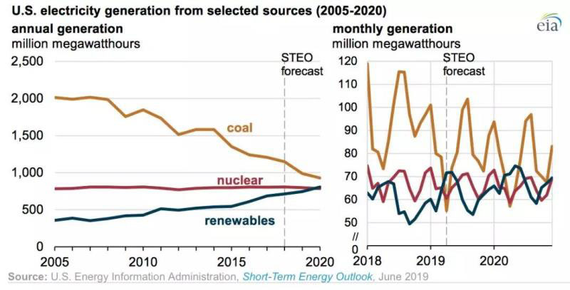 2019年4月這個(gè)月內(nèi),可再生能源發(fā)電比例一度超過(guò)了煤電,成為新聞焦點(diǎn)。然而,根據(jù)EIA的預(yù)測(cè),2019年全年煤電比例將有所下降,但將依然大于可再生能源發(fā)電:燃?xì)獍l(fā)電37.1%、煤電24.1%、核電19.5%、可再生能源發(fā)電18.2%,其他1.1%。