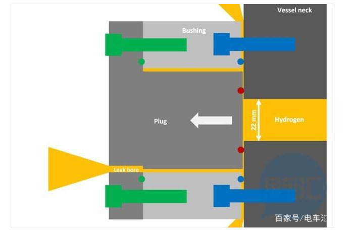 由于錯誤導致的螺栓扭矩,使整個接頭被抬起,并且在標藍處的密封件立即斷開。以淺灰色標記的襯套也會破裂,氫氣不受控制地泄漏了到空氣當中(標記為黃色):