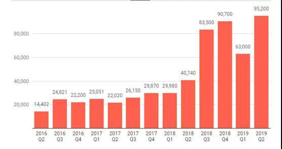 今年前3個(gè)月,特斯拉交付50,900輛Model3和12,100輛ModelS和ModelX,即共計(jì)63000輛,第二季與之相比增幅達(dá)51.1%。下圖是自2016年第二季度以來,特斯拉每一季度的交付情況: