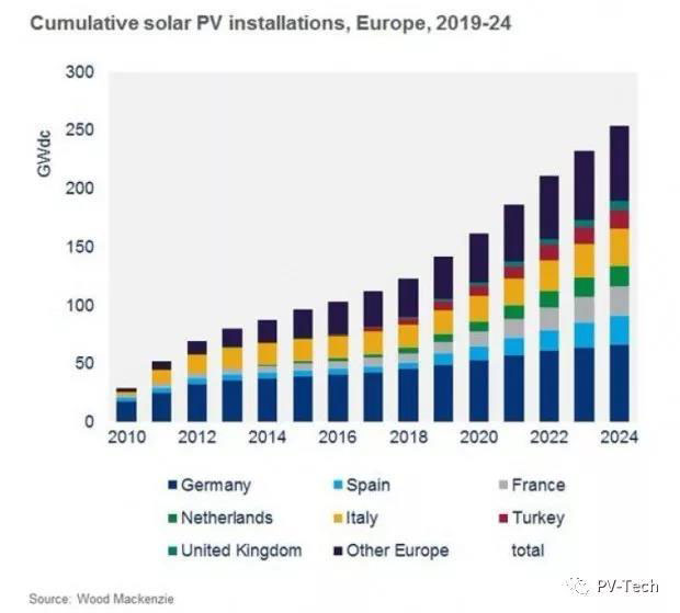 Wood Mackenzie預(yù)計,德國仍是無可爭議的歐洲光伏領(lǐng)袖。2019年至2024年,德國計劃開發(fā)20GW項目,之后一年,累計裝機(jī)量會超過65MW。