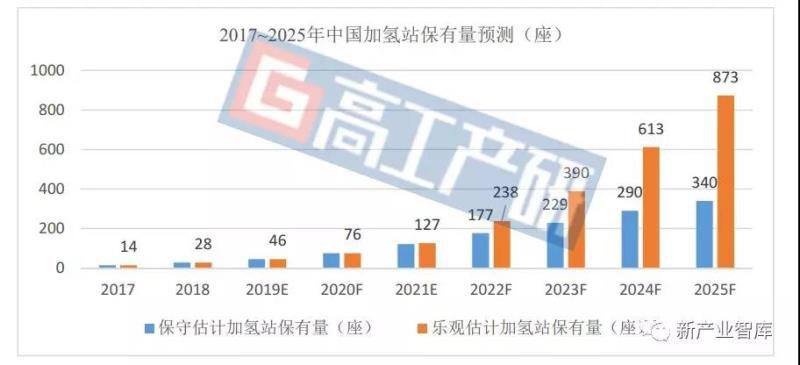 高工產(chǎn)研氫電研究所(GGII)預(yù)計,2020年中國加氫站的保有量將會達(dá)到76座,2025年中國加氫站的保有量在340~873座之間。