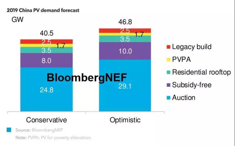 中國(guó)2019年光伏政策驅(qū)動(dòng)市場(chǎng)向兩個(gè)方向發(fā)展,一方面積極推進(jìn)平價(jià)項(xiàng)目的開發(fā),另一方面將于年中開展大規(guī)模競(jìng)價(jià),分配補(bǔ)貼。BNEF預(yù)測(cè),2019年,中國(guó)光伏新增裝機(jī)容量將在41GW至47GW之間,這將使得下半年全球光伏組件價(jià)格維持在穩(wěn)定水平。