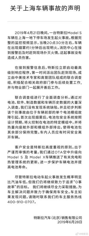 面對(duì)車主和社會(huì)對(duì)自燃事故的質(zhì)疑,6月28日下午,特斯拉汽車(北京)銷售有限公司公布《關(guān)于上海車輛事故的聲明》,對(duì)在今年4月21日發(fā)生在上海地下車庫(kù)的特斯拉電動(dòng)汽車自燃事故,作出回應(yīng)。