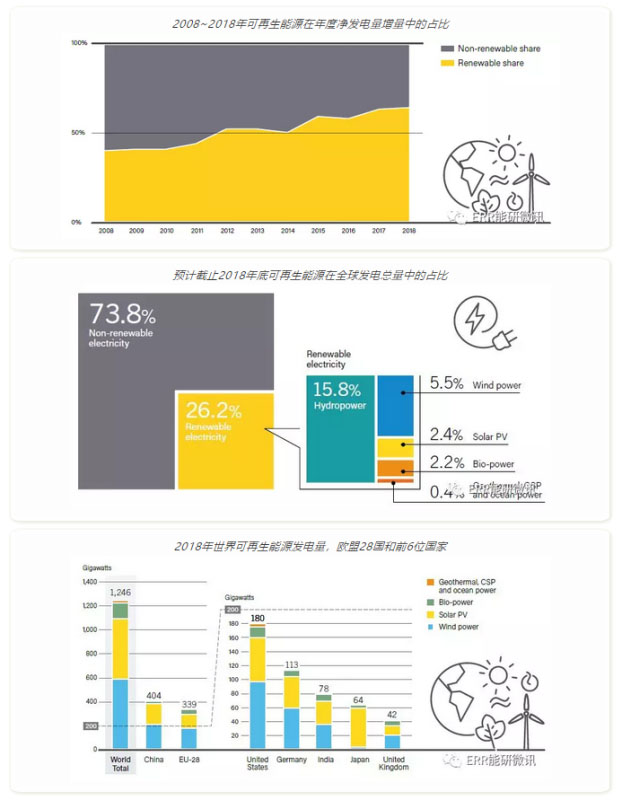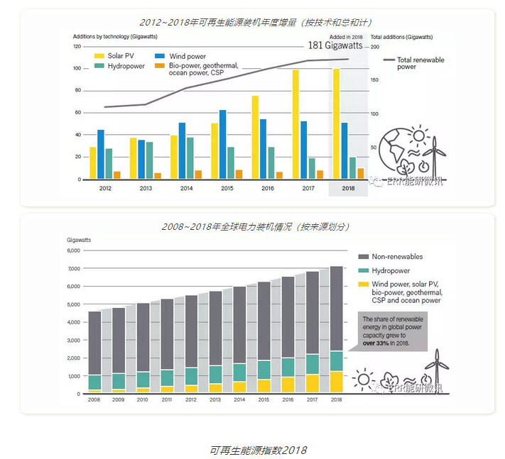 可再生能源的地位已在全球范圍確立。2018年,90多個國家安裝了至少1吉瓦的可再生能源裝機(jī),而至少有30個國家/地區(qū)的可再生能源裝機(jī)超過10吉瓦。風(fēng)能和太陽能光伏發(fā)電在一些地方的市場份額進(jìn)一步增加,目前越來越多的國家在電力結(jié)構(gòu)中擁有超過20%的間歇性可再生能源。