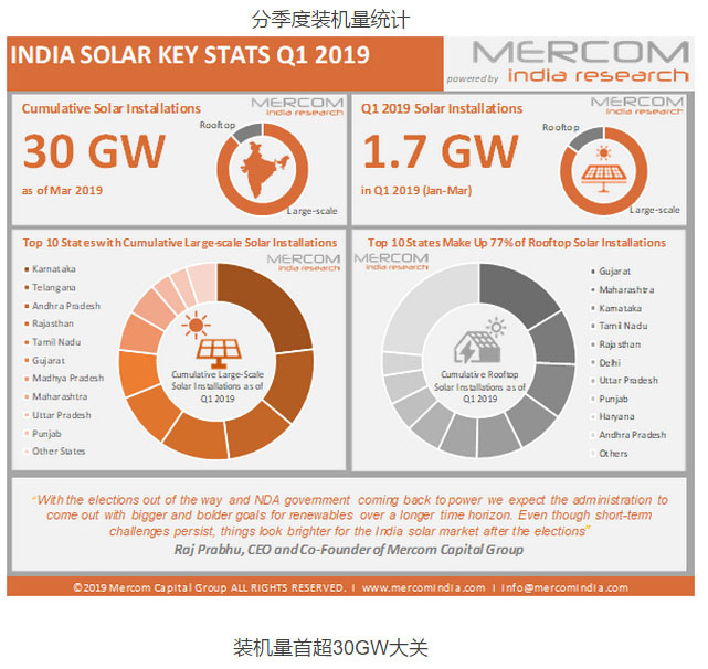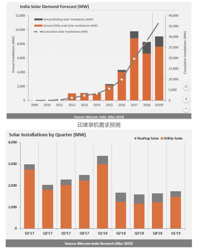 ·Mercom預(yù)測印度將在2019年(CY)新增9GW光伏裝機量。到2022年底,印度的太陽能裝機量將達到71GW,比政府設(shè)定的100GW目標(biāo)低近30%,但相信通過政府積極的推動和支持政策,目標(biāo)仍然是可以實現(xiàn)的。