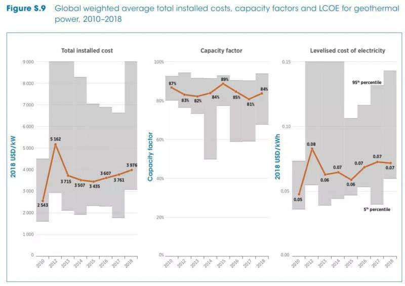 國(guó)際可再生能源署發(fā)布最新的可再生能源發(fā)電成本報(bào)告,2010-2018年全球地?zé)岚l(fā)電項(xiàng)目加權(quán)平均的單位投資成本、容量系數(shù)、平準(zhǔn)化成本走勢(shì)如下(以2018年美元計(jì)):